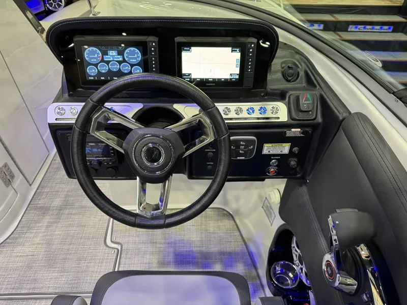 Additional Features: MerCusier 8.2L 380 HP w/DTS, Bow Thruster, Power Drop Down Swim Platform w/Boarding Assist Handle, Custom gelcoat pattern, Hull Color: Slate, Accent Color: Black, Arch - Black Aluminm Power Folding Arch w/Suntop, Titanm Matched Interior (Base Color: Grey Accent Color: Black), Power Dash - Black Shroud w/Double Stitch & Switches & Billet (Exch.), Fender Clips - 4 Bases w/4 Inserts, Trim Tabs w/Indicators, Rubrail - Black Extrusions and Performance Amplified Stereo System w/Sub.