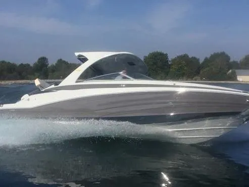 Options on this model include: engine upgrade to twin 6.2L Bravo 3 w/DTS controls (600 hp), gelcoat upgrade to Forte, deluxe color matched interior, soft touch moonrock snap in cockpit mat, fender clips (6 bases w/6 inserts), trim tabs (auto glide boat leveling system).