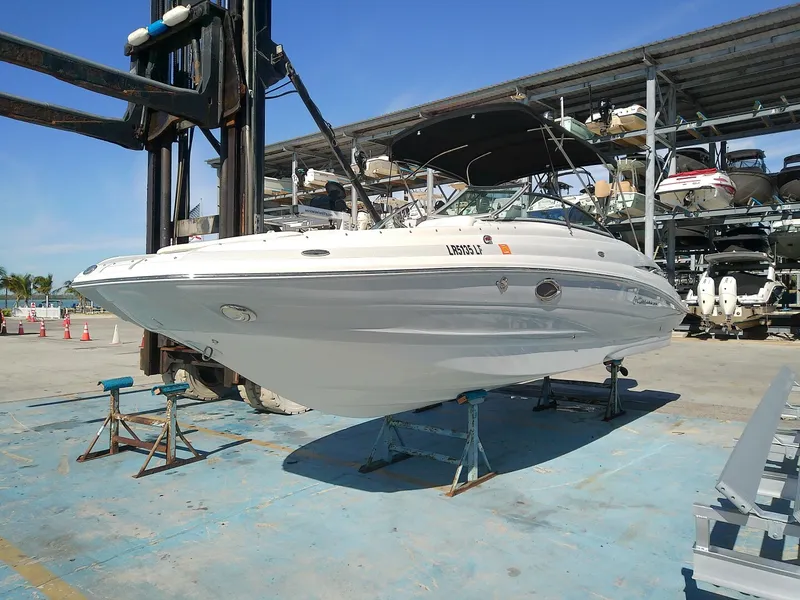 The boat is currently stored in an in and out storage facility, on the bunks and under cover. The exterior is washed down and engine flushed after every use.