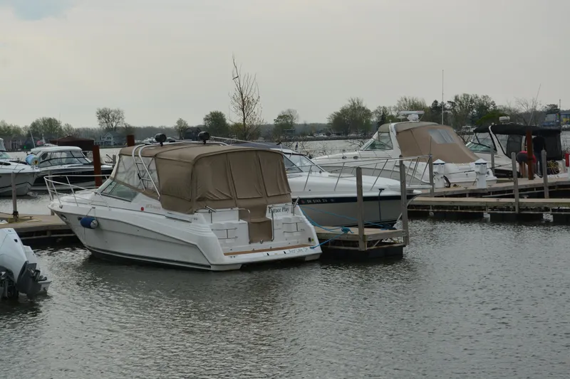 Nice example of a spacious express cruiser! Has newer sea dek flooring and camper canvas. Equipped with the very rare and desirable twin 7.4 LX EFI engines. Come check it out today!