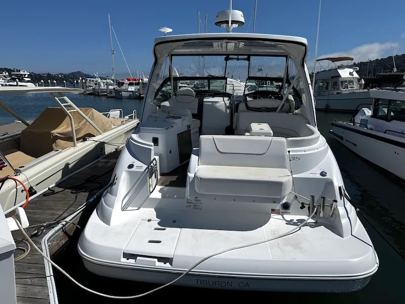 Cruisers Yachts 350 Express is a 35-foot sport express cruiser designed for luxury, performance, and versatility, suitable for day trips and overnight stays. It features a spacious, comfortable cockpit, a well-appointed cabin, and lush interior finishes, with an emphasis on high-quality materials and elegant details. The vessel offers impressive agility and handling, high-quality construction, and ample space and storage, making it ideal for both experienced and novice boaters who enjoy speed, social gatherings, and comfortable cruising. Joystick control , makes it easy boating, and the 8.2 liter twin engines allow for speeds of up to 50mph .