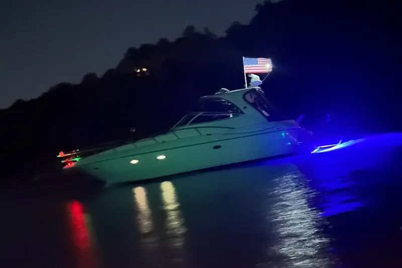 The bimini top, camper top and side curtains are all standard items. Below deck, a crescent-shaped convertible dinette / sofa curves along the starboard side of the yacht, a 20-inch flat-screen TV with combo VCR / DVD offers entertainment for lazy evenings on board, and the natural cherry wood interior creates a richness that pervades the entire living space.