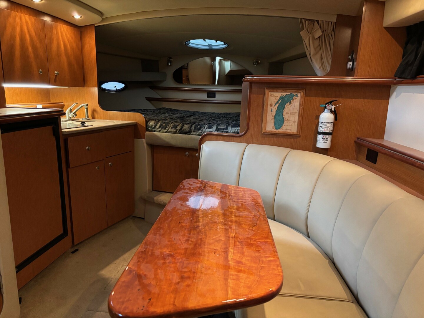 Great opportunity on this freshwater Cruisers 320 Express with great updates that include... Bow Thruster, Newer Garmin Plotter, Full Camper top, T- 5.7 Volvo/Penta motors with V drives, cherry interior, heated stored in winter months, and so much more. Built on a conventional modified-V hull with large integral swim platform, the floor plan of the 320 is arranged with a convertible settee in the aft lounge area, which is very open to the salon. Topside, a windshield with a walk through allows access to the bow. Engine access in the aft cockpit deck swings up on a pair of rams to expose the motors. This vessel is ready to take the family out.