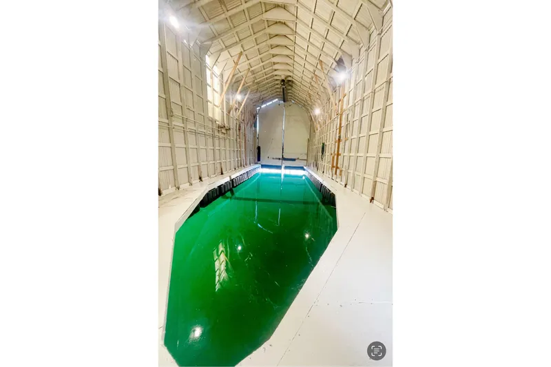 Boat house is 49' 4" plus bow bump out and 18'3" wide. Well is approximately 45'6'" long by 14' 6" wide.