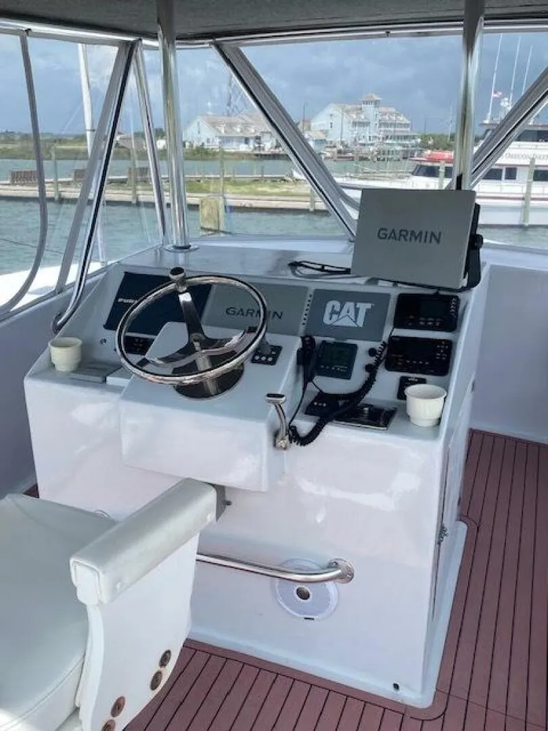 2022 56' CHARTER SPORTFISHER built by Captain / Owner Brian White Single CAT C-18 Acert 1150 hp / 790 hours and currently under warranty WOT 2350 rpm 32 kt / 1875 rpm 25 kt / 42 gph / 20kt / 27 gph LAYOUT Very spacious and simple, laid out comfortably and practically for day to day charter fishing. Teak interior wall coverings in salon and head, carpeted walls below in tackle and galley area. Teak and holly sole forward and down. Large cushioned bench seats with storage in salon. Tackle cabinets, cubbie and corner countertops with teak and holly surface. Large carpeted dash and soft stretched headliner with inlaid lighting throughout salon and tackle area. Tackle area below / Open layout with 2 double bunks to port, large teak lined coffee bar and galley countertop with microwave, refrigerator and ample storage. Also, bait freezer and large head with Raritan Atlantes marine toilet, storage closet, cubbies, countertop sink and mirrored back drop. Tackle and rod storage throughout this space. Private forward V berth with double bed, carpeted walls and step up ledges outboard of bed. Bomar hatch and more tackle storage. Visio flatscreen TV FCF 16K BTU AC / Heat ENGINE ROOM / MECHANICAL CAT C-18 ACERT / Twin Disc 2:1 Transmission PHASOR 8.5 KW Generator / 836 hrs. ProNautic 24.30 Battery Charger ProSport HD12 Battery Charger Vanner VoltMaster 100 AMP Battery Equalizer House and Starting Banks with Charging relay HydroSlave Steering system Reverso Oil Change System 110V Outlets Jabsco ProMax FW Pump Jabsco HotShot RW Pump Dripless Rudder seal Dripless Shaft seal 2 1/2" shaft and 34"x38" propeller Lenco trim tabs 230V AC panel 12V DC distribution panel COCKPIT AND DECK 3 Chair Setup / Center fighting chair and 2 ladderback Tuna chairs Mezzanine seating, ice dump, storage and bulkhead box and storage hatches 30 cockpit rod holders including chair Sea Grip deck surface Large transom fish box Cleats on cover boards and downrigger mounts Deck lights, huge spreader light on hardtop Ladder to Bridge hatch Bomar Deck Hatch to Lazz 50A Service Rupp 44' Triple Spreader Outriggers Green Stick BRIDGE/ELECTRONICS Center Console Layout 5 panel curtain enclosure Carpeted under hardtop Sea grip surface on sole Handrails Sleipner 12" 24V Bow Thruster Twin Disc QuickShift Controls ACR Spotlight 16" Garmin Multi-Function Display !2" Garmin Multi Function Display !2" Furuno KW Radar Display / 6KW Furuno Radar Garmin GMI 20 Icom IC-M510 VHF Standard Horizon Quantum VHF SiTex Sea Water Temp Gauge Fusion Stereo with Bluetooth and Fusion Speakers Single lever control Kite reel receptacle ACR Epirb