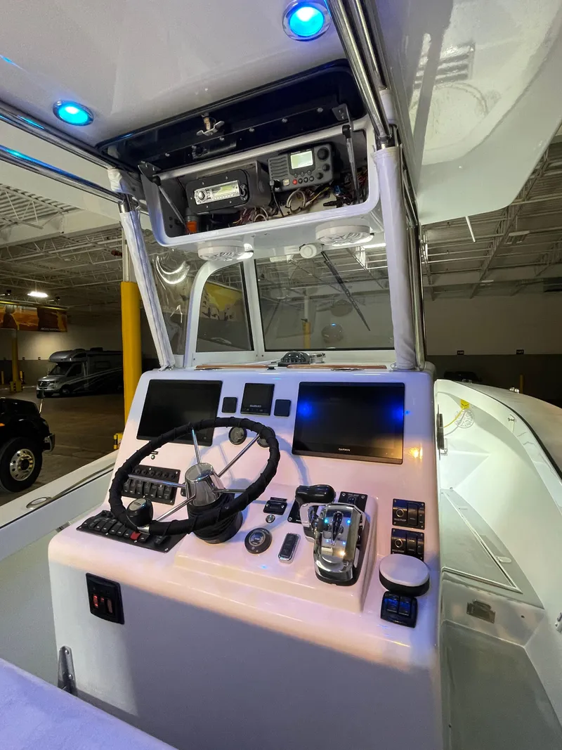 A beautiful one of a kind Custom Carolina style center console, built by Reid Bandy of Bandy Boatworks and painted by Composite Yacht. This boat also features a custom Garmin Electronics package, wiring and installation by Mid-Shore Electronics. She has the feel of a much larger boat due to the high sided, well thought out wide open lay out. One look at this center console and you'll notice lines like no others, truly a head turner. The original / current owner oversaw the complete build process and has kept her inside/dry-stored and never left in water or outside overnight, since day one. The paint scheme, Awlgrip Cloud White full hull color (including bracket) with T-Top to match and Medium Gray decks. Other features include, Stainless Hardware throughout, Tackle Center w/Aft Facing Bench Seating and Livewell Below Helm & Companion Bench Seating w/Seatback Rocket Launcher, T-Top Rocket Launcher & Radio Box, S/S Anchor Windlass System, Sea Star Hydraulic Steering, Garmin Electronics, Autopilot/Radar/Sounder, VHF Radio, Sony Marine Stereo System, Steering Wheel w/Power Knob, Minn Kota Terrova trolling motor and much more.