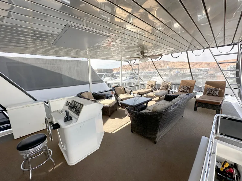 lounging/eating deck with second driving helm and kitchen, top deck with covered table