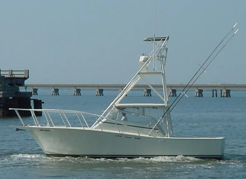 The boat features an airconditioned cabin and head. The bridge deck has an enormous amount of room for customer seating with large cabin windows. The protected lower helm has a full instrument package. Her Aluminum powder coated tower also has a full instrument package and is a great advantage when fishing. Lee's double spreader outriggers, 10 gunwale mounted rod holders and 10 rod holders on the back of the tower compliment the fishing package. The cockpit is 80 square feet of usable fishing space making larger charters possible and comfortable for all involved.
