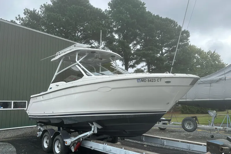 The Cutwater 24 Dual Console - Cutwater Boats' sporty offering is just as comfortable blasting around the lake with the kids in tow, as it is gliding along the shoreline for a sunset cruise. Designed and built to be a master of multiple functions, the C-24 DC provides exceptional versatility. Whether you're fishing, enjoying watersports, sightseeing, or entertaining guests, the C-24 DC opens up a new world of exciting possibilities. Powered by a Yamaha 300hp , she is fast, efficient and fun. Our patented laminar flow interrupters provide smooth positive cornering and her deep V forward and double stepped hull gets on plane quickly. The private head with marine toilet is roomy, comfortable, and bright thanks to the frosted overhead skylight. Standard features include Garmin Electronics with GPS and depth sounder, aft beverage cooler, rod holders, locking rod storage, fishbox, large under-seat cooler, retractable ski pylon, pop up stainless cleats, and abundant drink holders throughout. Options include bow thruster, refrigerator, livewell, hard top , Solar , windlass