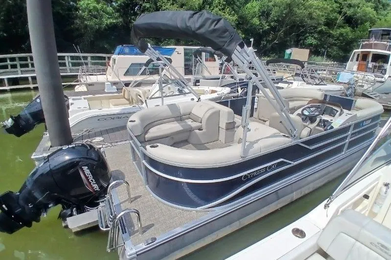 Confidence comes from intuitive ease of use, reliability and safety. The Seabreeze 232 packs those features and more on a 23-foot pontoon platform. The single-piece fiberglass helm is engineered to host all of your controls, gauges and accessory switches in a logical manner, for absolute control. The bell-crank hinges on the corner lounges allow your seat pad to conveniently fold out of the way and stay in place to access storage compartments. Reliability is improved with the use of high-quality materials and systems designed for a marine environment. Such can be found in our use of full-length extruded pontoon riser brackets that reduce torque and twist from the engine and wave action; or our color-matched roto-cast plastic seat bases which are channeled to direct water out to keep your gear drier. Safety is extremely important and the primary reason why you'll find tall fence rails and full-length gate-stops used on Cypress Cay boats. We are confident that you will be at ease with your choice of Cypress Cay.