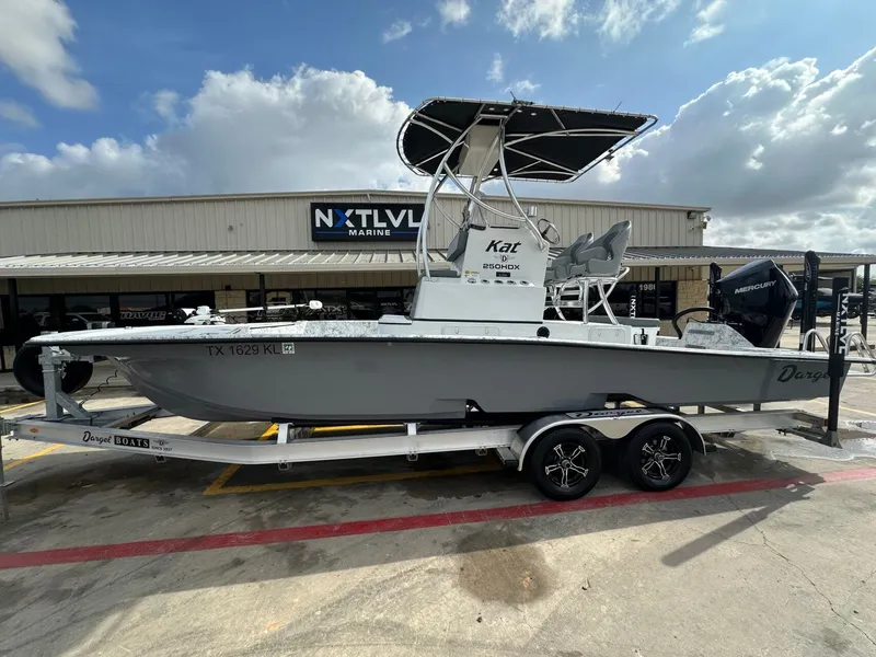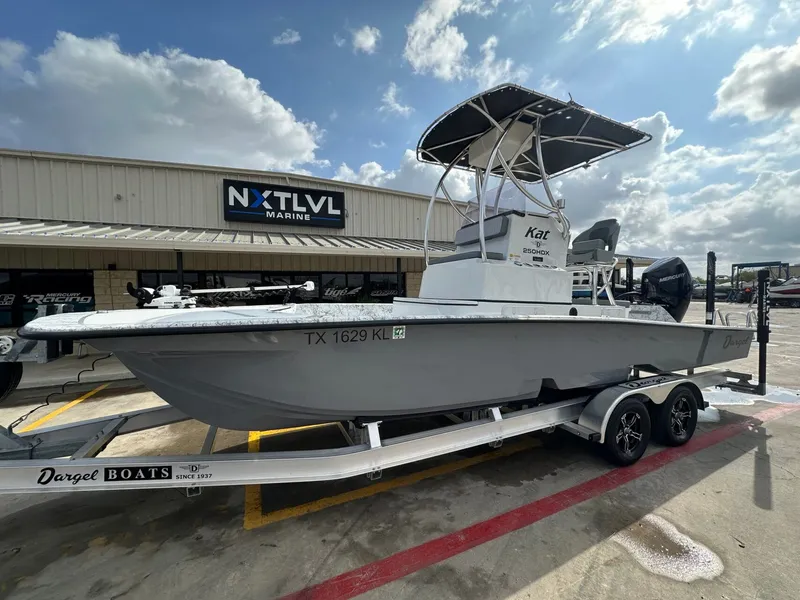 2021 Dargel 250 HDX Kat, Mercury 300 Four Stroke V8 with only 113 hours. Stored under cover since new so this one is in great condition. Lengthy list of options and features include: - Mercury 300 Four Stroke V8 with only 113 hours - SeaStar Electric Power Steering - Raised Console with 3rd Livewell - Upgraded 72 Gallon Fuel Tank - Dual PowerPole Pro II - 8' - Custom 5' x 8' T-top w/ Electronics Box, Cupholders, and Rod Eyelets - Bucket Seat Upgrade w/ Flip Up Bolster - Garmin 12" Color GPS/Sonar/Chart/Radar - Garmin VHF - Bluetooth Stereo - Minn Kota Terrova 36V I-pilot Trolling Motor w/ Onboard Charger - Underwater Lights - Boarding Ladder - Mercury Smartcraft Gauges - 75 Quart Yeti w/ Matching Cushion - And More