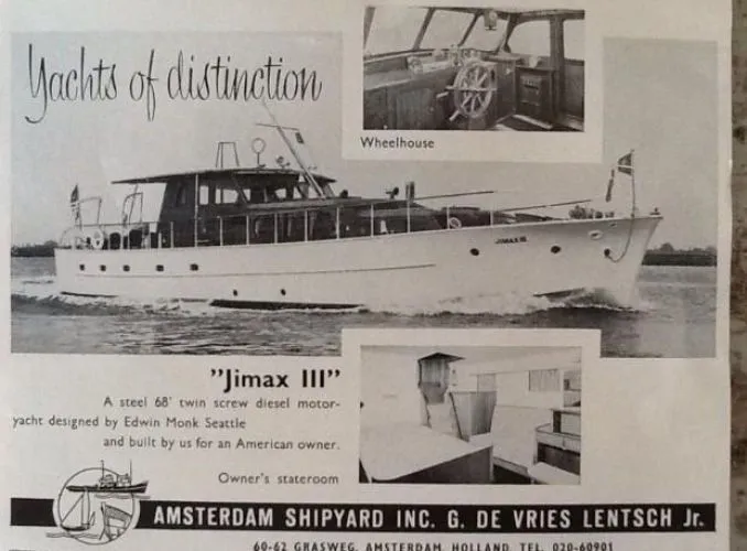 Ed Monk was a famous Naval Architect who designed many boats over the years. This one was built in the G. De Vries Lentsch yard in Amsterdam, Holland before Feadship existed.