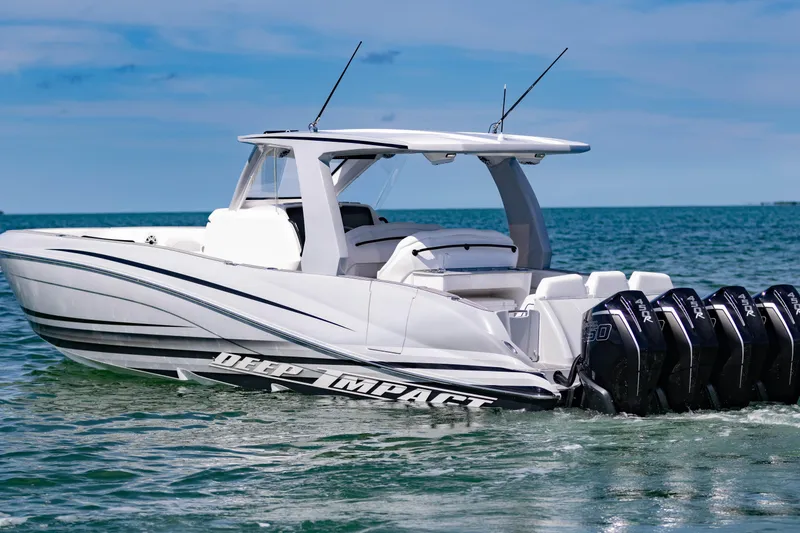 A true offshore weapon. This 2024 Deep Impact 399 Sport is professionally rigged, heavily upgraded, and turnkey for offshore runs, poker runs, or luxury cruising. With Quad Mercury Racing 450Rs, a full electronics suite, custom paint, and premium comfort features, this 39'9" Deep Impact delivers the perfect blend of speed, style, and capability.
