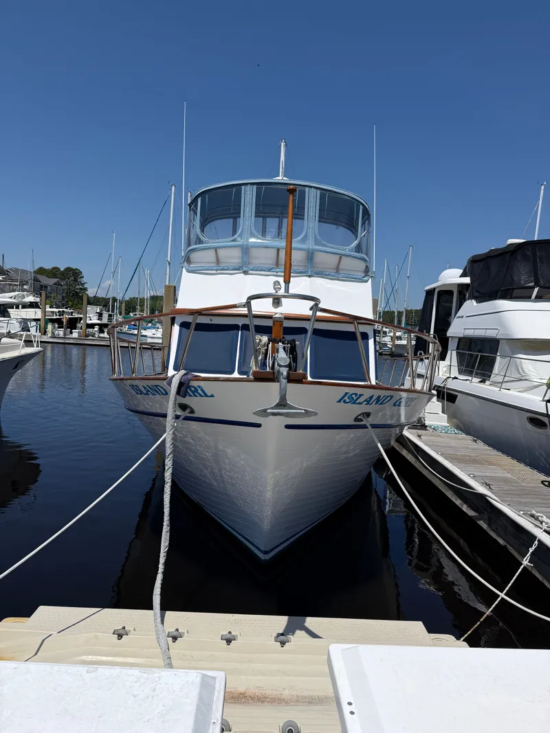 The aft Master Stateroom is full beam cabin with cabinet and storage lockers on port and starboard sides. There is an aft companionway that leads out to the expansive aft deck. The Master Head features an electric toilet and a bath tub! The Salon has two sliding access doors, one to port, the one to starboard, along with a fully equipped lower helm station, a large Galley aft and a nice L-Shaped Dinette with High.Low table. Flybridge with bimini and curtains round out the topsides. All the way forward gas your traditional V-berth with plenty of storage and ensuite head. Forward deck features large CQR Style primary anchor with chain rode and electric windlass. Teak decks are in satisfactory condition and brightwork is above average condition.