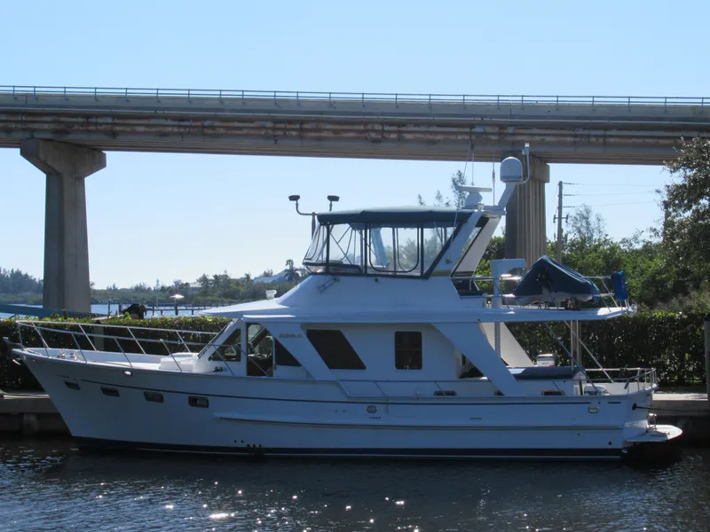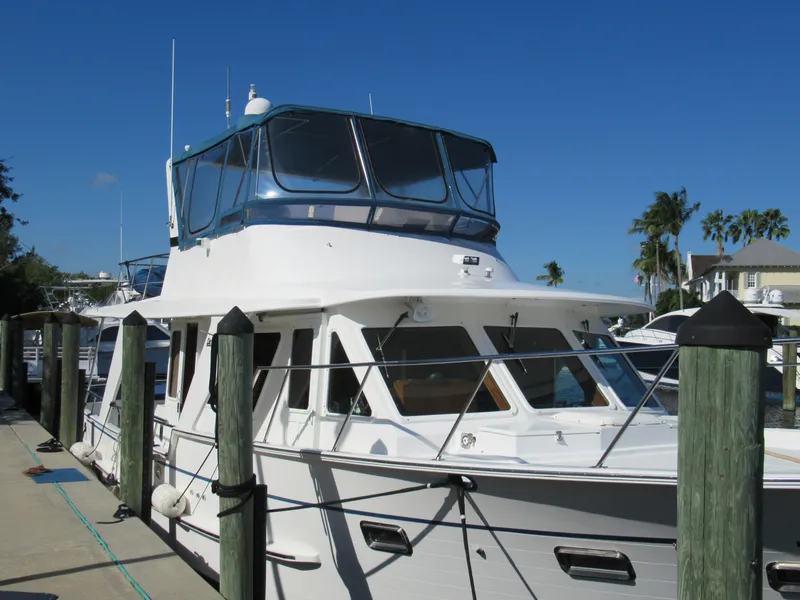 Bridge bimini with full enclosure and U windows (New 2021) Texteline forward salon window covers Brower 800lb davit Transom opening door Port and starboard bulwark opening doors Molded non-skid decks Heavy duty anchor roller-reinforced platform for windlass mounting Stern line hawse pipes with cleats Bow and spring line intrgal hawse holes with cleats Fly Bridge, L settee with vinyl cushions-storage under Welded stainless steel rails Hinged radar mast Forward stainless steel deck hatch Stainless steel opening ports with screens FRP canopy over aft deck with stainless steel supports Storage locker with fresh water hose bib on forward deck Maxwell VWX 2200 windlass Bruce style anchor with 200' chain/rode