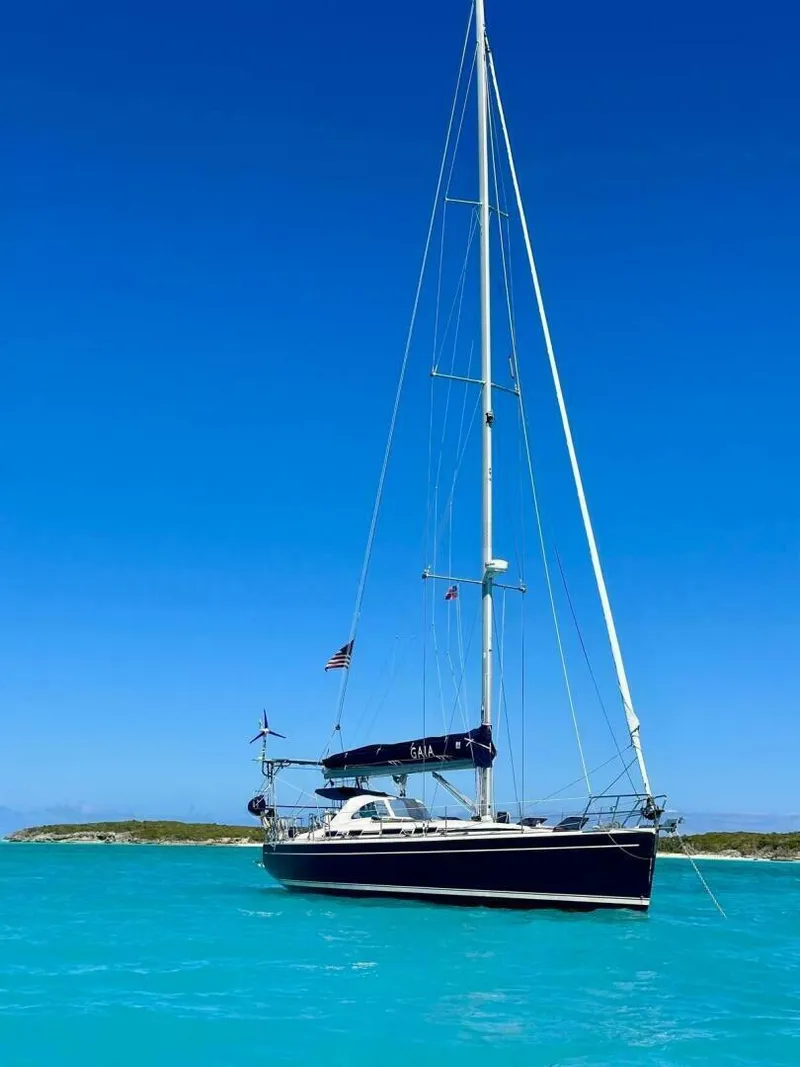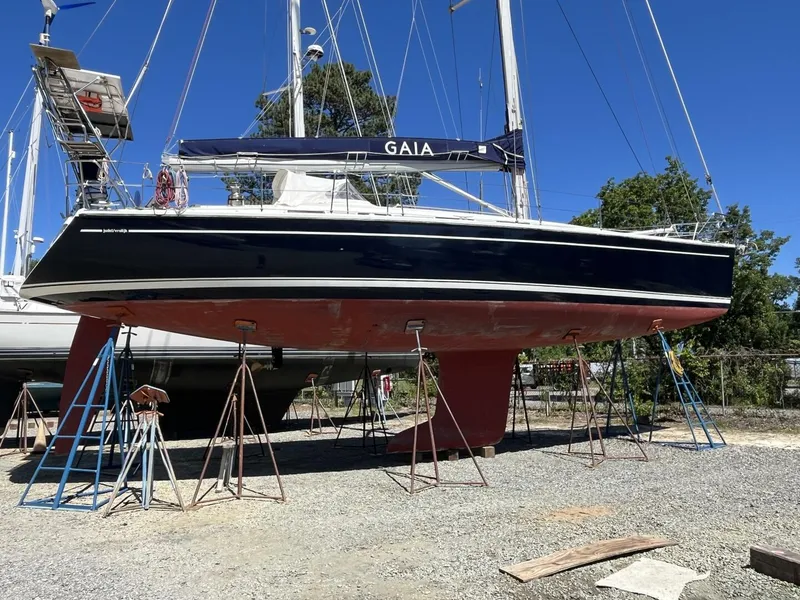 "Gaia" is a Jodel and Vrolijk designed Dehler 47 with vinylester hull, teak decks, deep draft (7'9")and tall rig (75'). It was built for passagemaking and is stiff, fast and sturdy sailing machine that churns through the miles in all weather conditions. The three cabin layout is ideal for a family or for a couple who can use the third cabin as a storage unit. She is currently on the hard in Deltaville, VA, having just returned from winter in the Bahamas. The hull is newly waxed and polished and the bottom is to be painted.