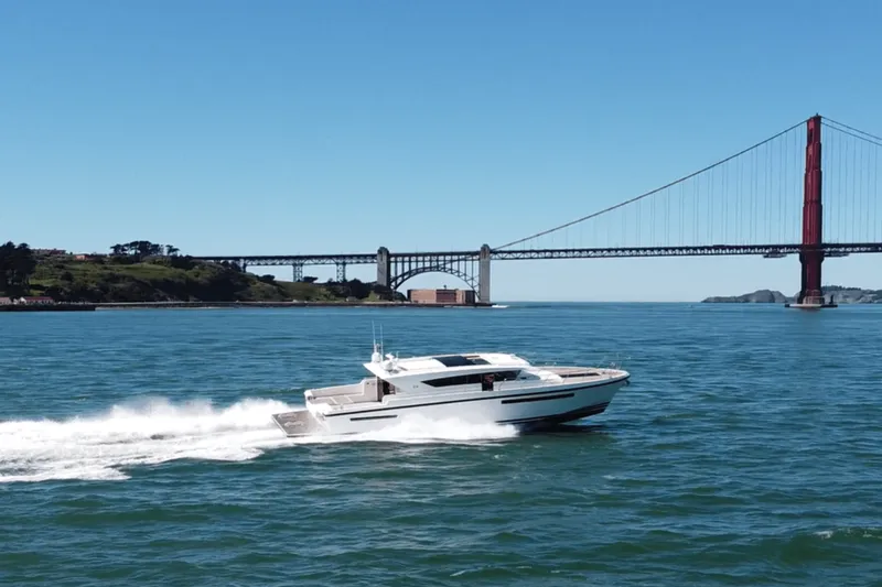 Innovative Design: Its sleek, contemporary aesthetics and aerodynamic profile stand out on the water, reflecting cutting-edge naval architecture.