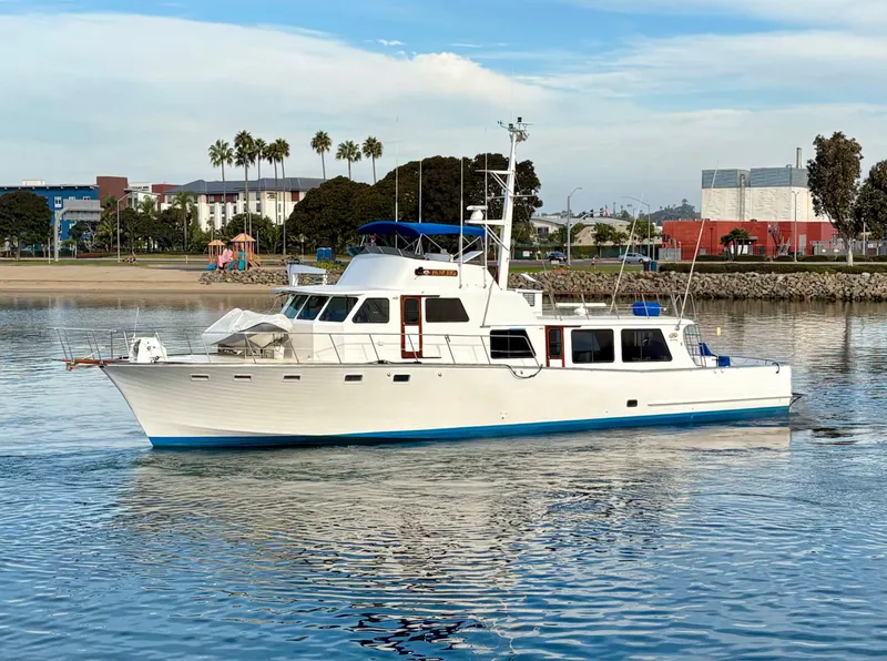 Long range yachtfisher with pilothouse helm, flybridge helm, and cockpit controls. Full walk around decks with dinghy davit on foredeck. A commercial chain and cable winch type windlass with pulpit is also on the foredeck. The flybridge with helm includes ample seating for guests. The upper deck aft of has mast for electronics, and direct access to the engine room via a ladder inside the large airway hatch. The cockpit features engine controls, dual bait tanks, sink w/tackle storage, 2x transom doors, and swim step.