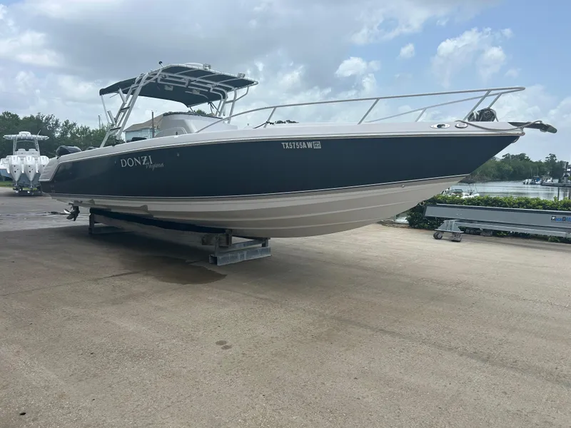 The Donzi 35 ZF enjoys a hard-earned reputation as one of the most distinctive and sought-after high performance center consoles on the water. With its sleek styling, accommodating layout and breathtaking performance, the 35 ZF easily accommodates a wide range of on-water activities. The 35 ZFs comfortable cockpit features richly upholstered drop-down bolster seats and wraparound cockpit coaming bolsters. Theres an enclosed head compartment with nearly six feet of headroom concealed beneath the center console, equipped with a freshwater sink, shower, and head. A curved, tempered-glass console windshield looks great while offering protection. Donzi offers an aluminum T-top with electronics box, spreader lights & integrated overhead PFD storage, or opt for the Daytona package for a powdercoated aluminum arch with fixed forward canvas brow and retractable bimini top. Trailer inlcuded