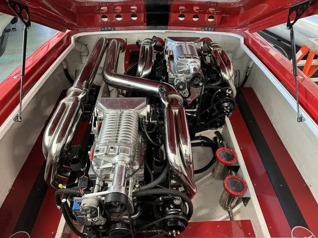 This boat was built for a race boat, never raced - weighed in at 8600 lbs. Engines were purchased new from Teague (80 hours), drives were totally gone through / re-built (6 hours ago / Bam Transmissions 6 hours). Interior was re-done / customized recently. Very Little use since - Stored In Temp Controlled Building. Boat Runs, Rides, Handles, & Sounds Awesome!! 120 MPH - For a 2004 it's nice (some minor blemishes)