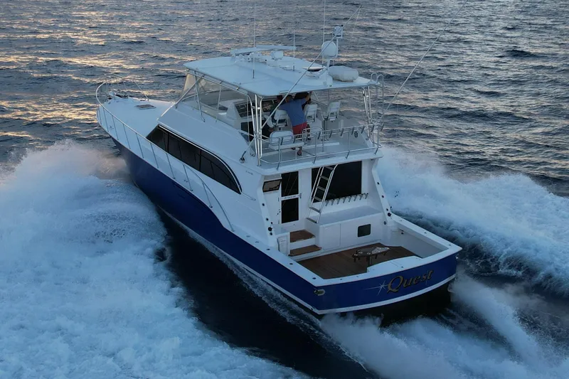 The cockpit deck is covered with over 200 square feet of premium grade teak (replaced 2021). The cockpit is centered by a custom teak rocket launcher. An oversized bait preparation area with tackle drawers, and bait tank is to starboard with a transom mounted bait tank. Rod holders are installed on gunnels, the aft superstucture, and on the aft rail of the bridge. A new set of Marshtacky carbon fiber outriggers finish the custom fishing package. A custom dive ladder for easy boarding is stored below. Custom 244 Gallon Bait Tank System on mezzanine bulkhead (2) 60 gal Bait tanks mounted in the transom New Teak Deck in Cockpit 2021 Multi Color Underwater Lights (2 Deep Sea Marine) Maxwell Windlass Liberty RC 2500 Ultra Anchor 100lb 200' chain 600' 8 plat rode - New 4/2019 18 Custom Rockets Launchers Eskimo Ice Maker 540lb per day - New 5/2019 House Mounted Marshtacky Outriggers - New 11/2020 Life Raft Switlik SAR 6 - New 3/2020 (6) Murray Rocket Launcher