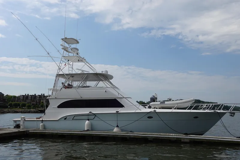New to the market the current owner has owned her for 18 years a must see the Tournament Fisher with many updates and with Caterpillar 3412e's Installed in 2003 have had all services done with only 1585 original hours. Twin Kilopak 30KW Generators 831 original hours fully serviced. Many features including Glendenning cable master, Outriggers, Fighting chair, Deck crane, Tuna Tower, Izon-glass recently replaced, Custom cockpit mezzanine, Fly-Bridge electronics updated to Garmin, Bridge cushions updated, Bridge Frig, Epirb, Bridge stereo. Salon Flat panel TV and stereo, Wine cooler, (2) Quartz tables, Washer dryer, Full galley, Central Vac and much more. The master stateroom center island bed, Flat panel TV, Stereo, Hayman safe, A/C and heat, Full head including full shower. VIP stateroom Full bed and a bunk, Stereo, A/C and full head with stall shower, Guest stateroom single and pull-man bunk, Stereo and A/C, Crew/Guest stateroom sleeps 2 with L-Bunks and head. Total of 4 staterooms and 3 heads. THIS FISHING MACHINE IS A MUST SEE !!!