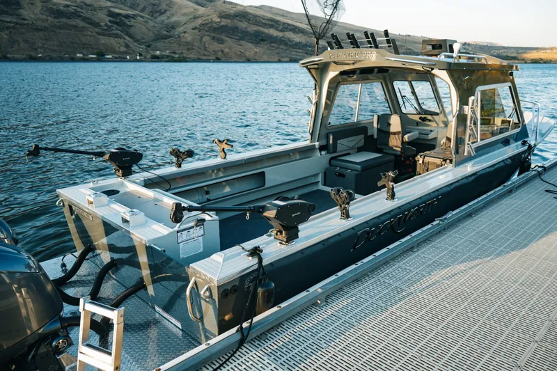 , The Duckworth 26 Pacific Pro is the next evolution in a line of proven performers, built on the legacy of the highly successful 22 and 24 Pacific Pro models. These boats earned their reputation for reliability, capability, and comfort, and now, the 26 Pacific Pro takes it even further. The biggest upgrade? A full 2 feet of additional fishable cockpit area. This expanded deck space gives anglers more room to move, cast, and fight fish, while also accommodating a larger, more efficient floor fish box to keep gear organized and your catch fresh. At 29 feet overall, the 26 Pacific Pro features a sharp 32-degree bow deadrise and towering 39.5" sides, delivering a confident, smooth ride in rough conditions. Whether you choose the steadfast full hardtop or the adaptable Alaskan bulkhead with its lockable door, this vessel is built to go further and fish harder. With a maximum horsepower rating of 450 hp in either single or twin-engine configuration, the 26 Pacific Pro offers performance without hesitation and capability without compromise. Specifications Length (including bracket) 29' 3" / 8.9m Beam 8' 6" / 2.6m Side 0.125" / 3.18mm (5052-H32) Height of Sides 39" / 99cm Bottom 0.190" / 3.18mm (5052-H32) Bottom Width 7' 6" / 2.3m Interior Freeboard Height 29" / 74cm Approx. Dry Weight 4430lbs / 2009kg Fuel 84 USG / 318L diurnal fuel system Deadrise Bow: 32° Forward: 28° Transom: 18° Max HP Rating 450 HP / 336kW Maximum Capacities 9 persons or 1485lb (674kg) 3800lbs (1724kg) motor, persons, gear