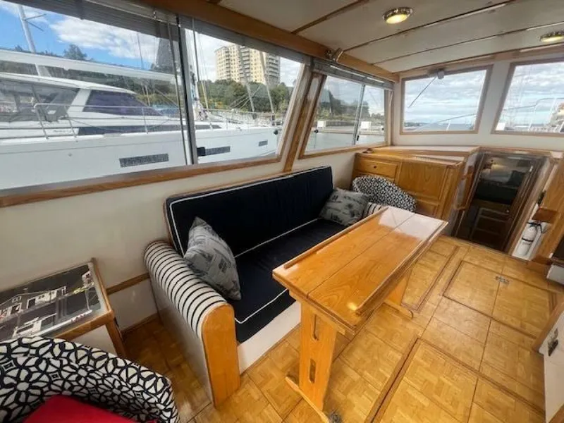 - Up several steps to the spacious main salon with the lower helm to starboard, chart table with electrical panels under, and lift up helm seats for two.