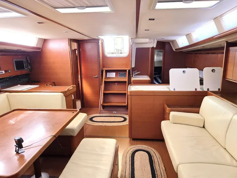 Gently sloping stairs allow easy access below deck. The interior is a beautiful, rich mahogany with off-white faux-leather cushions and is bright and airy. Headroom varies from 6'3" in the berths to 6'5" in the saloon.