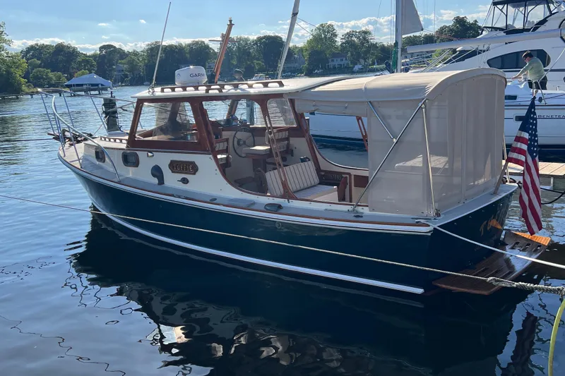With her sweeping sheer line, rounded chines, long keel & 15 knot cruising speed, this classic boat is known for her quick, comfortable dry ride. Her large cockpit with a custom table is perfect for entertaining.