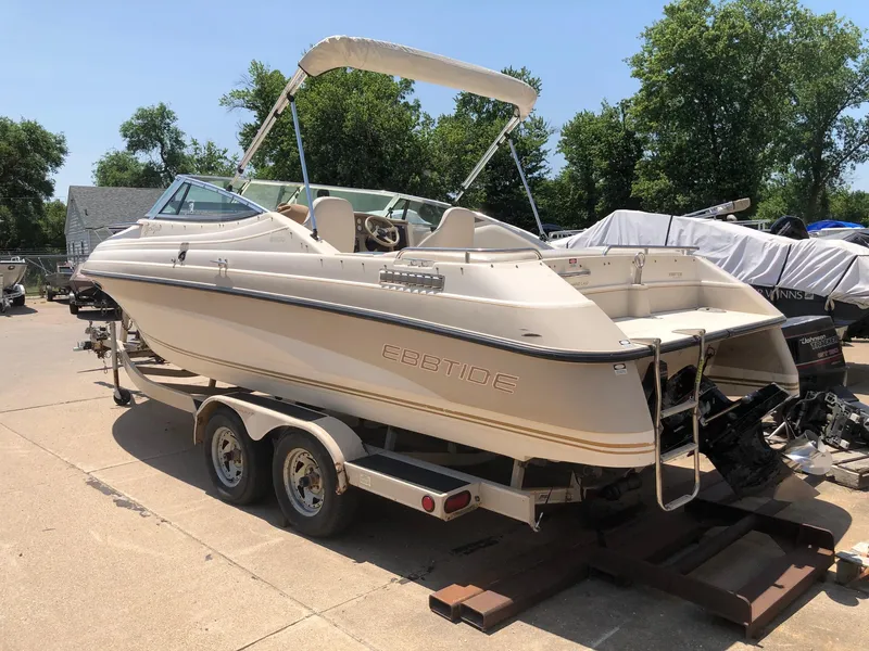 1997 EBBTIDE 2300 CUDDY (23') - 5.7L 250HP V8 MERCRUISER - 1997 TENNESSEE TANDEM TRAILER - VERY CLEAN NICE INTERIOR - CARPET & UPHOLSTRY LOOK NEW - CUDDY CABIN UPHOLSTRY VERY CLEAN TOO - SWIM PLATFORM & BOARDING LADDER - COCKPIT COVER IN GOOD CONDITION - RATED 8 PERSONS - 2 BUCKET SEATS - BIMINI TOP & SIDE WINDOWS & AFT CURTAIN INCLUDED - STAINLESS STEEL PROP - 1 GOUGE IN LEFT REAR SIDE (SEE PIC) - PIECE BROKE OFF ON CAVITATION PLATE (WON'T HURT) (SEE PIC) --- VERY NICE BOAT --- $11995 BUT SEE BELOW.