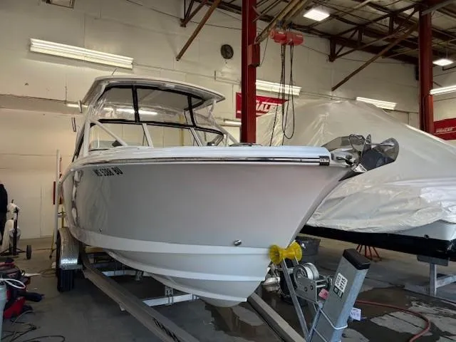PEWTER HULL, WHITE BOTTOM, HARDTOP, UNDERSIDE PEWTER GEL, YAMAHA 300 XSB, WITH DIGITAL ELECTRIC STEERING, WHITE AWLGRIP PAINTED ENGINE, WHITE ACCENT CUSHIONS, PREP STATION WITH SS SINK, SS RUB RAIL, GARMIN 8612 W/B75M 20 TRANSDUCER, BLACK CURTAIN ENCLOSURE, BLACK BOW AND COCKPIT COVER, POWDERCOATED TRANSOM ROD HOLDERS, STEREO FUSION W/JL 7.7 M3 SPEAKERS (4)