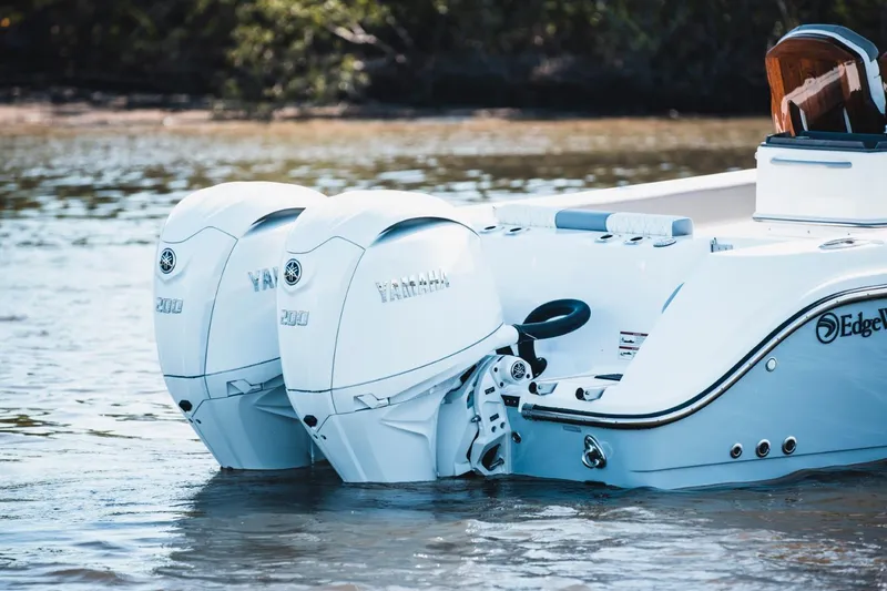 The 262CC arrives fully equipped with the essentials serious boaters expect- twin Yamaha 200's, a powder-coated leaning post with bench seating and a sliding ICON cooler, a U-shaped bow lounge with smart storage, and a forward console seat built for comfort. Fishing features come baked in: rod holders, a 28-gallon live well, raw and fresh-water system, and a folding boarding ladder. At the helm, a matte-black dash, digital switching, LED lighting, and Yamaha electronic power steering form a clean, modern command center ready for any water it meets. And much more-far more than we can list here.