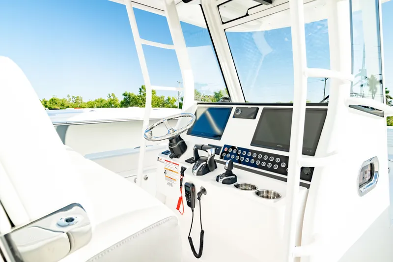 The 340CC has an optimized length-to-beam ratio for a family-fishing machine with a deep-V hull. We created an integrated visibility step that folds into the helm seat base. When deployed, it allows anyone to comfortably drive the boat. Storage is key for the family. Underneath the forward lounge seat is an expansive amount of storage for gear, dive tanks or fenders, buckets, bow table and forward backrests. It's a 34-foot boat with 40-50-foot type amenities. Options and Features Include: