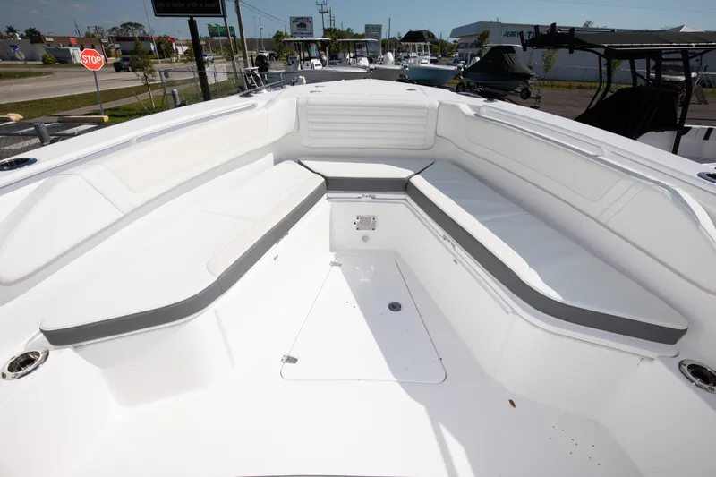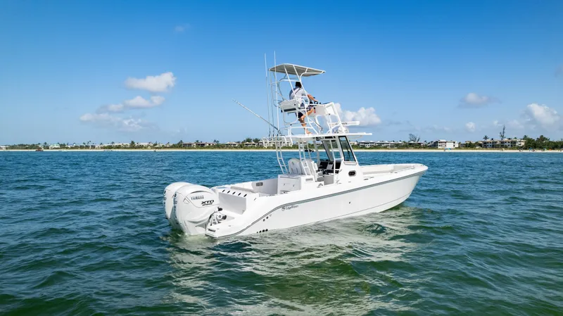 The 340CC has an optimized length-to-beam ratio for a family-fishing machine with a deep-V hull. We created an integrated visibility step that folds into the helm seat base. When deployed, it allows anyone to comfortably drive the boat. Storage is key for the family. Underneath the forward lounge seat is an expansive amount of storage for gear, dive tanks or fenders, buckets, bow table and forward backrests. It's a 34-foot boat with 40-50-foot type amenities. Options and Features Include: