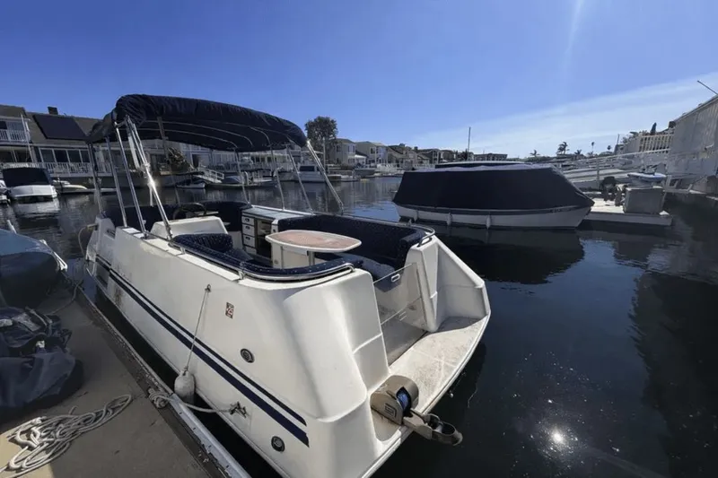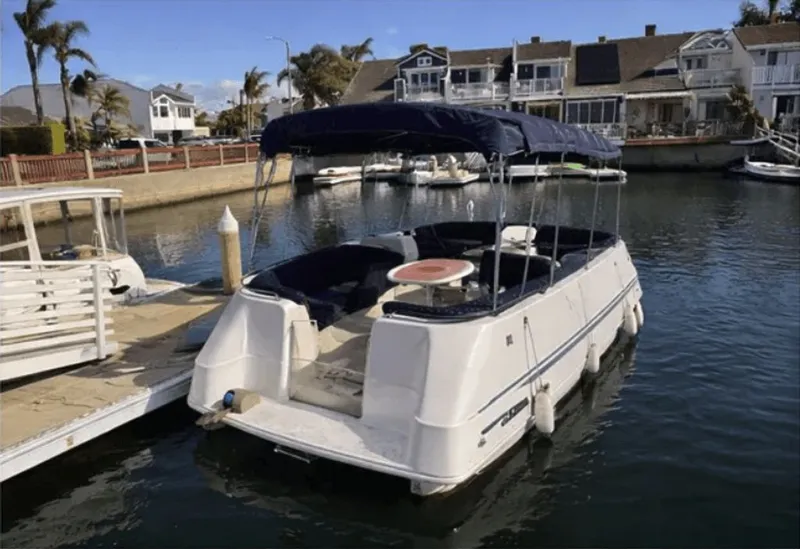 The hull shows normal cosmetic wear consistent with age, including some dock-side staining. The canopy shows signs of wear but remains fully functional. The interior upholstery is in good overall condition, and the boat has been stored in the water.