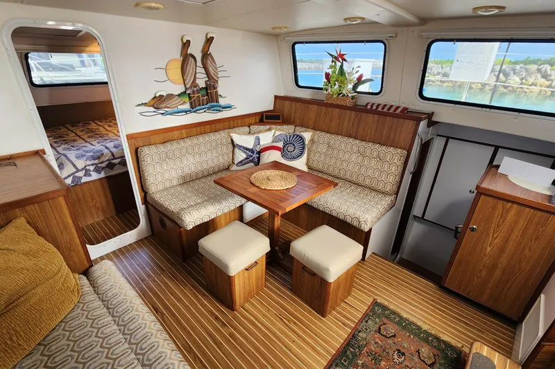 The Yanmar Engines (240hp 4LHA-STP) are very economical but can power up quickly to get you where you want to go. They are easily accessible under the Guest Beds with a door access. No laying on the floor to check the oil. The props and rudder are Tunneled, helping to protect then in case of an accidental grounding or from lobster/crab pots. Her shallow draft of just over 3 feet allows her to go where many other boats cannot and eases the stress when traveling many areas.