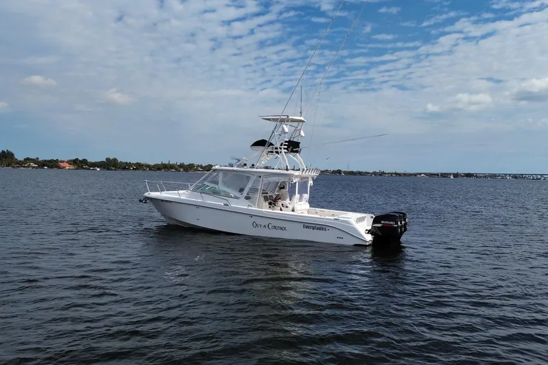 This Everglades 350LX is a big-water center console built for serious offshore capability with the comfort and protection to stay out longer. Powered by triple Suzuki 300HP 4-stroke outboards with 1,800 hours, this boat is outfitted with a tower, outriggers, and a strong electronics package that was updated with Simrad screens in 2023.