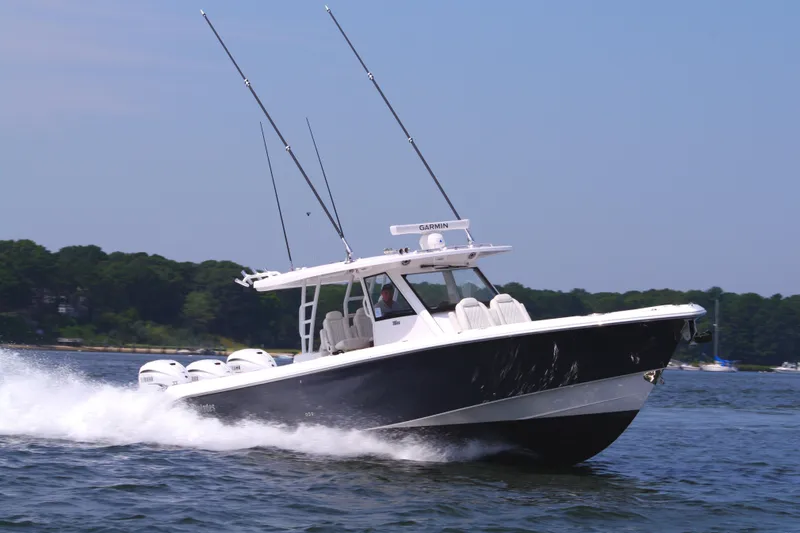 A ground-breaking progression of technology, power, fishability and yacht-like luxuries in a modern center console boat. The 395cc is at its core a meticulously outfitted fishing machine with best-in-class fishing features and design. Beyond its tough fishing exterior lies a new level of luxurious comfort and aggressive styling, making the 395cc a powerful experience for the senses.