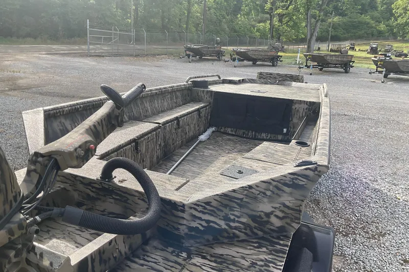 This is how it all started with Excel; by building the toughest and simply the best-built duck boat made. Heavy-duty gunwhales can take a beating from timber. Tank-like bracing throughout doesn't make this boat a lightweight, but it will outlast any other boat made. The step deck ( Excel was the 1 st to offer this feature) takes the leg-work out of getting in and out of your boat. Mossy Oak Bottomland camo. Bobs kicking jack plate, Light package green, Light bar paint same color as boat, 3000lb built in winch and Areate livewell.
