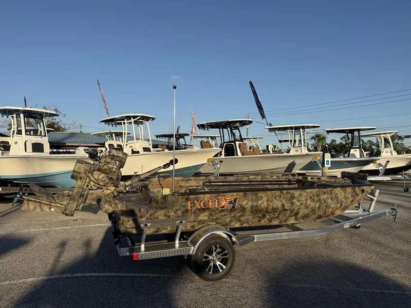 BRAND NEW 2026 EXCEL 1764 SHALLOW WATER F4 WITH MUD BUDDY HDR4000 AND ALUMINUM TRAILER OPTIFADE TIMBER CAMO SPUD POLES PORT GUNWALE TRAY GUN BOX