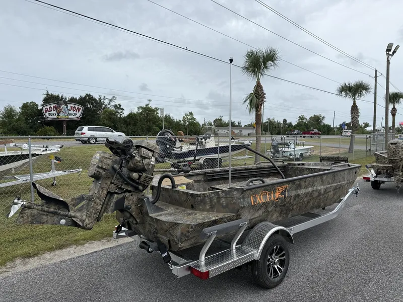 BRAND NEW 2026 EXCEL 1764 SHALLOW WATER F4 WITH MUD BUDDY HDR4000 TIMBER KING AND ALUMINUM TRAILER OPTIFADE MARSH CAMO AND ENGINE CAMO SPUD POLES PORT GUNWALE TRAY GUN BOX
