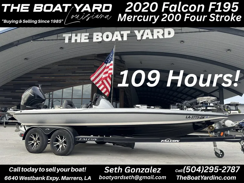 Stock #22012020 Falcon F195Mercury 200 hp. Four-StrokeTandem Axle Trailer***FINANCING AVAILABLE!***Boat Specs:Length 19' 5'Beam 93.5'Width on Trailer 95.5'Fuel Capacity 40 GALLivewell Capacity 34 GALApproximate Dry Weight 1675 LBSLength on trailer - towing length 25'Engine down with tongue folded 22'10'Engine down, turned, with tongue folded (shortest length) 22'9'***TRADES ACCAPETED!***Contact Seth for more information:Call: (504)295-2787