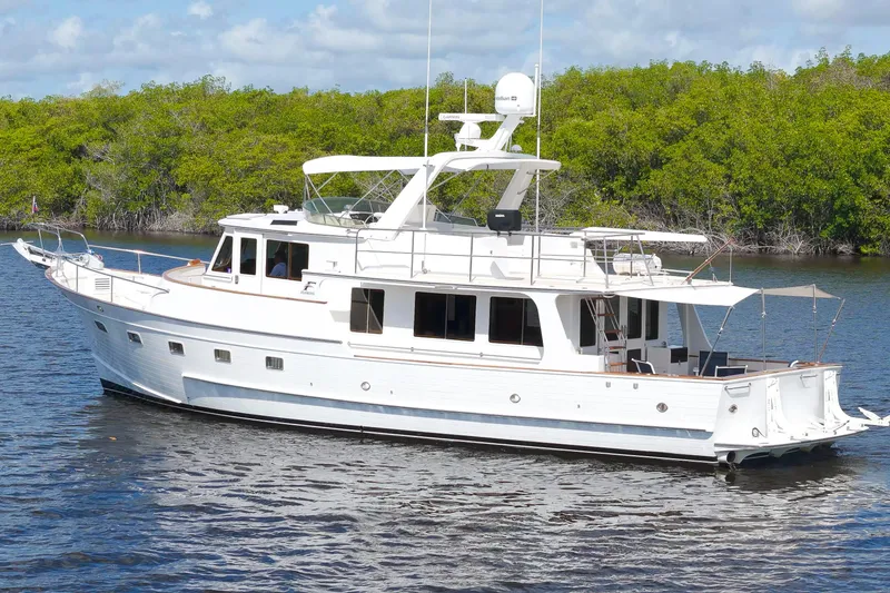 A well equipped and maintained Fleming 55 with two CAT 3208TA engines and twin Phasor generators. This boat has many modern updates and retrofits including: significant engine & generator service and maintenance, full Garmin navigation electronics and radar package (2020), non-skid foredeck & Portuguese bridge deck (2020), all-new teak decking at the cockpit (2020), fully revised galley arrangement with new appliances and granite countertops, upgraded air conditioning system, updated soft goods throughout (2022), Starlink WiFi system, and a Presto dingy/jetski lift at the transom swim platform. Other features include: Aqua-drive anti-vibration drive systems, Wesmar stabilizers and bow thruster, cockpit sunshade awning, and a bimini top overhead. Interior accommodations include three staterooms with two heads: a starboard stateroom with upper and lower bunks, port stateroom with two twin-sized berths, and a en-suite master stateroom with a island queen berth to forward.