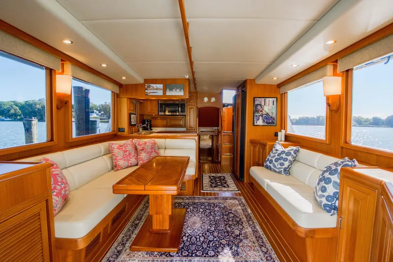 Entering from the aft cockpit deck you are immediately greeted with a capacious salon. Featuring the timeless appeal of teak cabinetry, vast windows, teak sole with holly accents, and most importantly, an interior layout that balances form with function. This layout allows for an open social environment while keeping the function of the galley separated from the rest of the salon. With a 16’ beam and spacious open floor plan encompassing the salon with the galley, entertaining guest becomes effortless.
