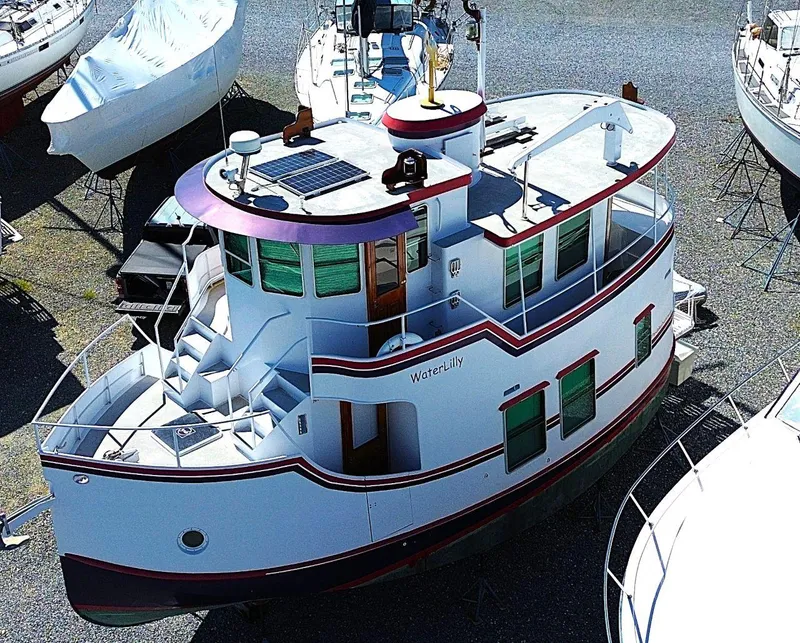If you are searching for a unique boat, look no further. If you are looking for the most volume possible in a 35' boat, look no further. And, if you want to stand out amongst all the white plastic boats, definitely look no further! Great Loop, Intracoastal cruising, coastal cruising or liveaboard, Water Lilly covers it all with comfort, seaworthiness and incredible fuel efficiency. She offers a single Perkins 80 HP main engine,Westerbeke 8 kW generator, bow and stern thrusters, shallow draft, raised pilothouse, a very private master stateroom on the upper deck, light and airy interior and a two stateroom layout with a head and enclosed shower.