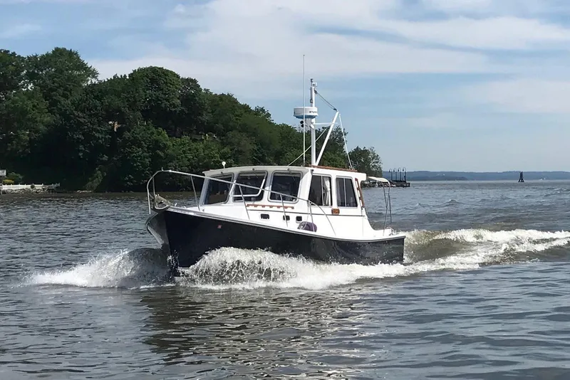 This is a true Maine lobsterboat hull not a "stylized" V hull made to look like a lobsterboat. A turn key, well maintained, unique downeast, heavily built, hand laid, custom fiberglass launch. This boat is a very stable, 31' 9" and almost 12' beam. With her full bow, spray rails, full keel and high freeboard this girl will take you anywhere and get you back home safely, comfortably and efficiently.