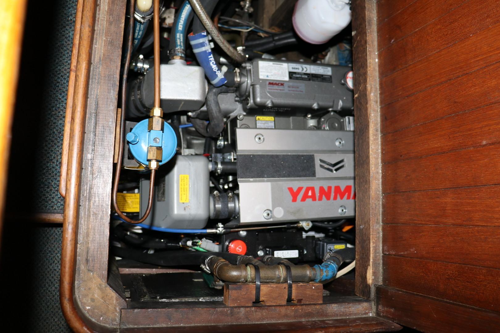 SALON - Spacious settees are located to port and starboard with easy access to the water tanks beneath. Teak lockers are fitted outboard and above the settees. A teak cabinet mounted on the centerline in the aft portion of the salon houses the engine and has two removable panels for engine access and a folding teak salon table. There is an Espar Deisel heater control as well as recessed LED lighting. A total of four bronze ports and one large deck hatch provide excellent light and ventilation to this cozy salon.