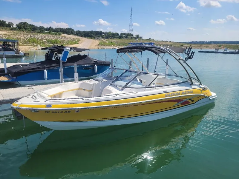Mercruiser 496 MAG with Bravo-III outdrive with Mercury SmartCraft digital temp guage ~262 freshwater hours. Includes stainless tower with port side rack and canvas bimini top, bow/cockpit canvas covers, snap-out carpet, dual swim ladders, docking lights, dual batteries with switch, head compartment(no potty), new Garmin GPSmap navigation, Kenwood marine receiver with Clarion digital amplifier, helm remote inoperable, factory table top with shaft and fill cushions for bow sun pad. Complete with factory matching Dorsey tandem axle BT with haul-out guides.
