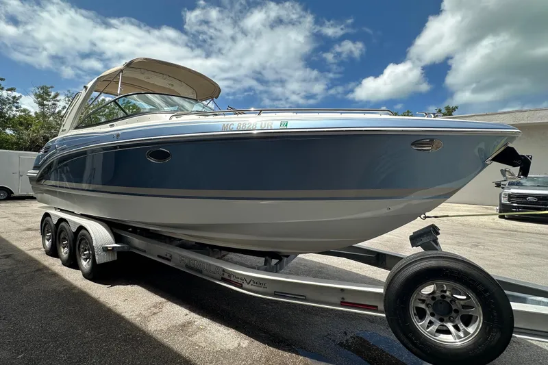 Garmin Chirp 54cv Chartplotter, 12V Battery Charger, JL Audio lighted cockpit speakers, porcelain head with pumpout, Electric Windlass, Bow backrest and filler cushions, Bow Docking Lights, Fender clips, VHF Radio, Fiberglass Arch, extended Sport Swim Platform, Blue LED Cockpit lighting system, Corian Ravine Wetbar, Ski Pylon, SS Flag Staff, All Weather Bow and cockpit cover, Latte Bimini Top, Aged vinyl Teak on plaform and Woven cockpit Mat in Morning Sand color round out the optional equipment.